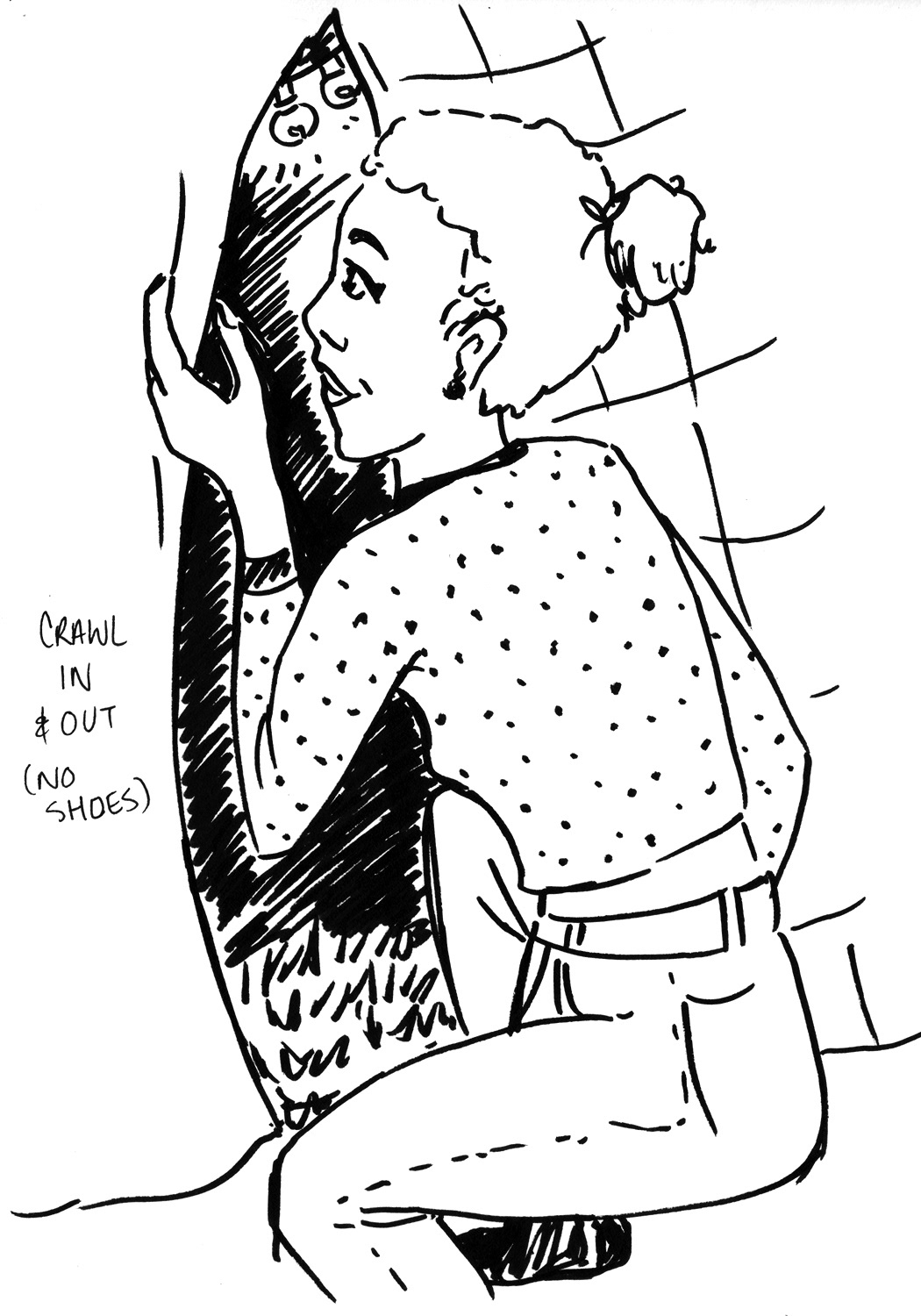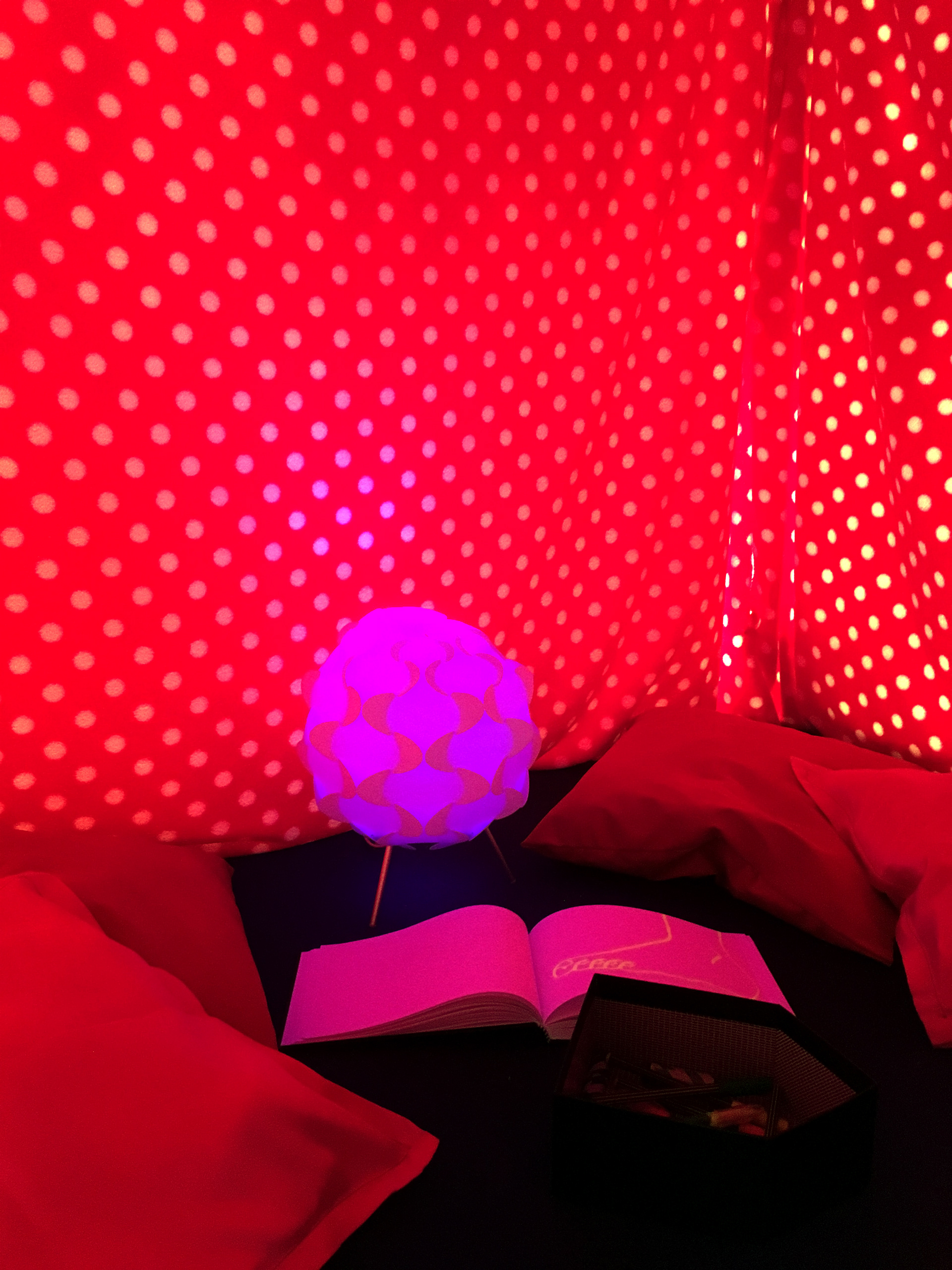 Inside the fort colours become fluorescent as it is lit by black light, the walls are soft plush, and the ground is cushioned to allowing one to stay comfortably. Once seated the individual(s) has the opportunity to pick up a sketchbook including a few doodles of my personal memories drawn with invisible ink. They are only visible inside the installation under the black light. The sketchbook triggers visitors to relate in their own manner with my memory—re-imagine it for themselves according to their personal experiences. After cognitively processing the existing drawn memories, the individual is welcomed to contribute to the cycle by drawing their own fond memory into the book’s blank pages with the provided invisible ink pens.
